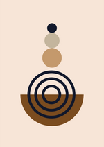 Abstracte geometrische schilderij met een stapel cirkels en halve cirkels in bruin-, beige- en blauwtinten op een bleke achtergrond.