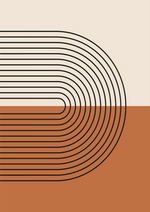 Abstracte geometrische schilderij met een reeks zwarte halve cirkels op een beige en terracotta achtergrond, waardoor een optische illusie van diepte ontstaat.