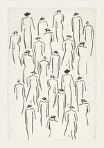 Een schilderij met een grote groep mensen, allemaal met een hoed. De personen zijn getekend met een enkele streep.