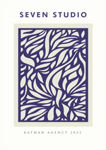 Een schilderij met daarboven Seven Studio en allemaal blauwe op een beige achtergrond.
