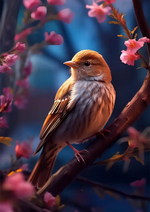 Dit schilderij toont een kleine vogel met bruine aftekeningen en een lichtgekleurd gezicht en borst op een tak versierd met roze bloemen tegen een vervaagde blauwe achtergrond.