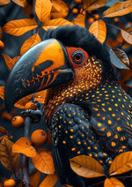 Op dit schilderij zie je een prachtige vogel met levendige oranje en zwarte veren, hoog zittend tussen oranje bladeren en vruchten. Met zijn grote, gebogen snavel en gedetailleerde stippenpatronen op zijn veren, straalt de vogel kracht en schoonheid uit.