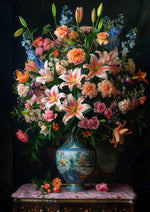 Dit schilderij toont een prachtig bloemstuk in een elegante vaas, met een mix van roze lelies, rozen en andere levendige bloemen. Het geheel staat op een patroonrijk oppervlak, met enkele bloemen die over de rand steken, wat een natuurlijk effect geeft.