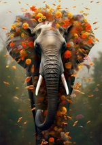 Dit schilderij toont een olifant omringd door een krans van kleurrijke bloemen en bladeren die lijken rond te zweven en op te gaan in de achtergrond.