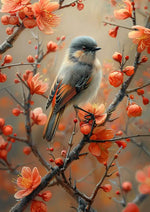 Op dit schilderij zie je een charmante vogel met grijze en oranje veren, rustend op een tak te midden van bloeiende oranje bloemen. De zachte, vervaagde achtergrond laat de vogel en bloemen op de voorgrond prachtig naar voren komen.