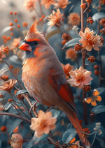Op dit schilderij zie je een levendige vogel met een opvallende rode kuif, omringd door bloeiende oranje bloemen en groene bladeren. De achtergrond is gevuld met meer bloemen en een kleine vlinder in de buurt.