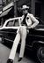 Een schilderij van een man, gekleed in wit leunend tegen een auto aan.