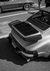Dit schilderij toont een zwart-witfoto van het achteraanzicht van een vintage Porsche, met een verhoogde achterspoiler, geparkeerd in een zonovergoten straat naast een andere klassieke auto.