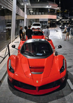 Dit schilderij toont een rode La Ferrari geparkeerd in een stadsstraat 's nachts, met voetgangers in de buurt en andere auto's geparkeerd op de achtergrond. De setting kenmerkt zich door moderne architectuur met verlichte accenten.