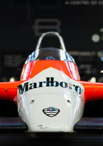 Dit schilderij toont een close-up van de neus van een vintage racewagen, met een oranje en wit kleurenschema met 'Marlboro'-sponsorlogo's en een klassiek embleem.