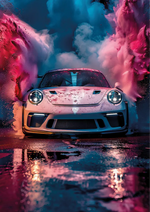 Dit schilderij geeft een mooie kleur explosie weer van een nardo grey sportwagen die een burn-out trekt.