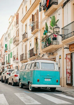 Een vintage turkoois Volkswagen-busje geparkeerd in een straat vol traditionele gebouwen in Europese stijl met balkons, sommige versierd met planten en wasgoed.