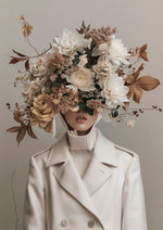 Dit schilderij toont het gezicht van een persoon in een crèmekleurige jas en coltrui, gedeeltelijk verborgen door een groot bloemstuk met bloemen en bladeren in wit, beige en bruin tegen een neutrale achtergrond.