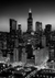 Dit schilderij vangt een zwart-wit luchtfoto van een stadsgezicht bij nacht, met een opvallende wolkenkrabber met torenspitsen en talloze verlichte gebouwen. Een indrukwekkende weergave van dichte stedelijke architectuur.