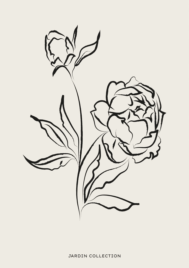 Een schilderij van een roos, in het zwart getekend op een beige achtergrond.