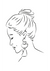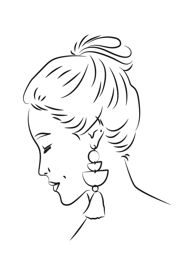 Een zwart-wit schilderij met het gezicht van een vrouw, met haar haar in een staart en met oorbellen.