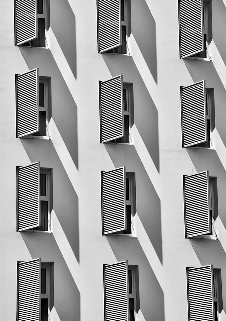 Zwart-wit schilderij van een gevel van een gebouw met open ramen.