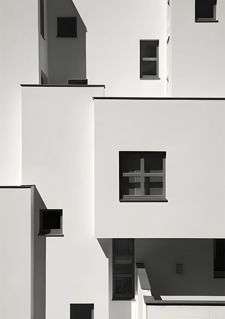 Zwart-wit schilderij met zicht op de witte gevels van een modern gebouw met zwarte raamkozijnen.