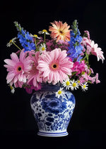 Schilderij van een boeket in een blauw-witte vaas met roze en perzikkleurige gerberamadeliefjes, blauwe delphiniums, witte madeliefjes en kleine roze bloemen op een zwarte achtergrond.