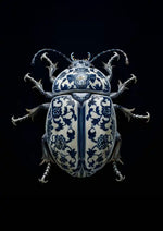 Dit schilderij toont een gedetailleerde kever met een exoskelet versierd met blauw-witte bloempatronen, geïnspireerd op porseleinkunst, compleet met verfijnde poten en antennes.