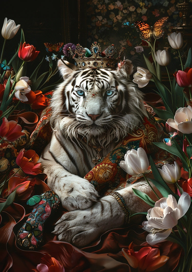 Dit schilderij toont een witte tijger met een kroon met juwelen, leunend tussen levendige tulpen en vlinders, gedrapeerd in koninklijke stof tegen een kleurrijke achtergrond.