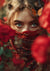 Een vrouw met felblauwe ogen, omringd door rode rozen, straalt mysterie en intensiteit uit.