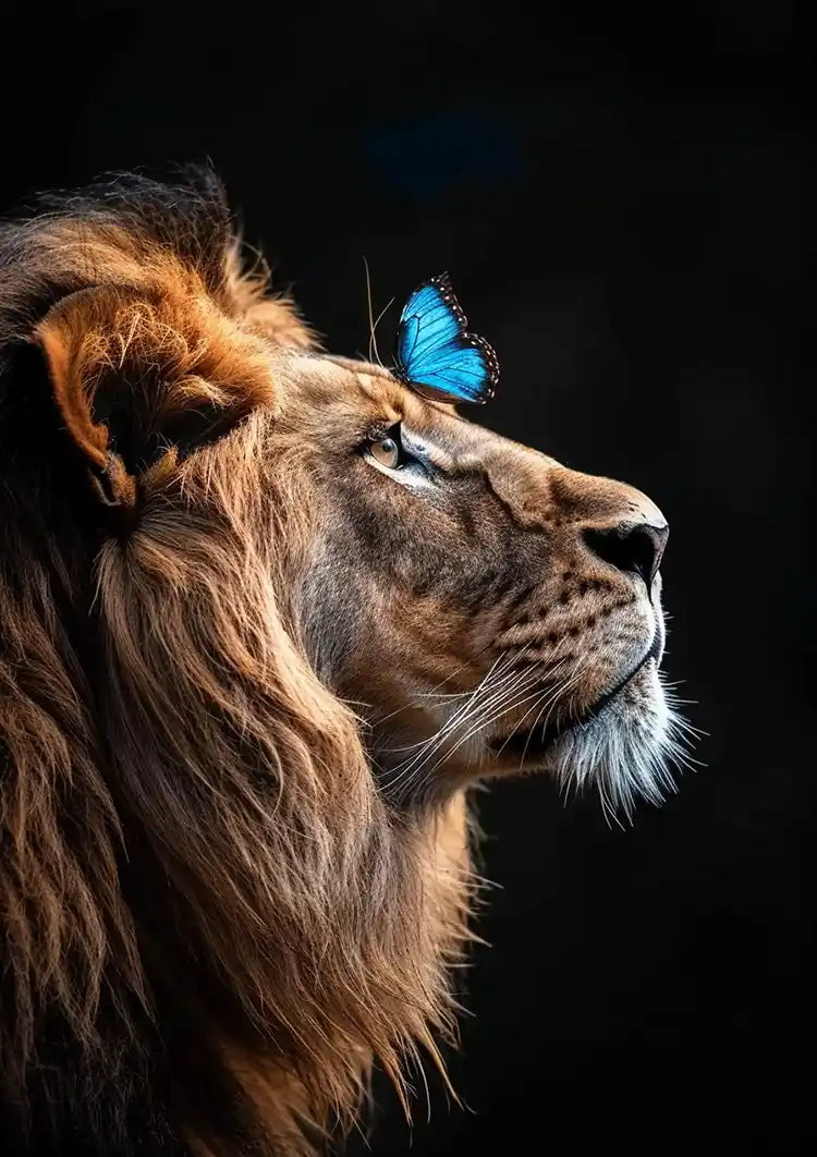 Dit schilderij toont een close-up zijprofiel van een leeuw met een blauwe vlinder op zijn voorhoofd tegen een donkere achtergrond.