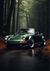 Dit schilderij toont een donkergroene klassieke 911 die geparkeerd staat op een vochtige weg omringd door hoge bomen in een dicht bos. De carrosserie van de auto is strak en glanzend, met ronde koplampen en zwarte wielen. De atmosfeer is mistig, met zacht, diffuus licht dat door de bomen filtert.