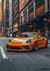Dit schilderij toont een strakke, feloranje auto geparkeerd in een stadsstraat in de vroege avond. De auto heeft zwarte accenten, waaronder velgen en aerodynamische kenmerken. Hoge gebouwen met reflecterende ramen flankeren de straat, verlicht door stadslichten.