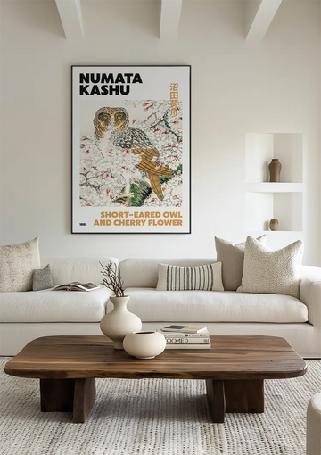 N. Kashu Short-Eared Owl And Cherry Flower Schilderij