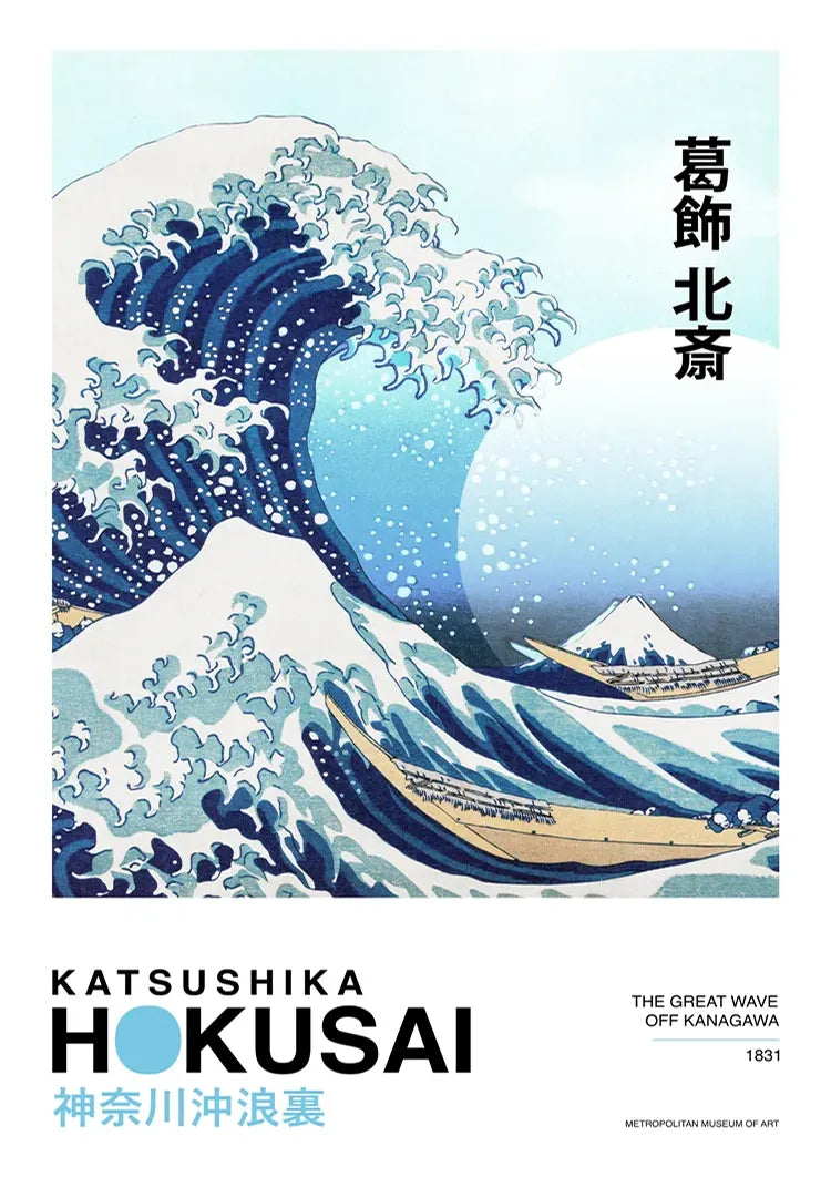 Dit schilderij "The Great Wave off Kanagawa" van Katsushika Hokusai toont een grote golf die boven boten uittorent met de berg Fuji op de achtergrond.