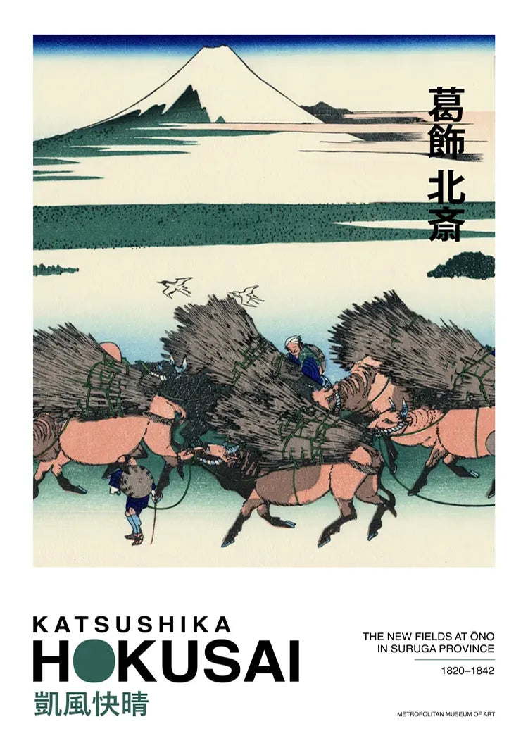 Dit schilderij "The New Fields at Ono in de provincie Suruga" van Katsushika Hokusai toont een landelijk tafereel met arbeiders en ossen die torenhoge bundels gras dragen, met de berg Fuji op de achtergrond.