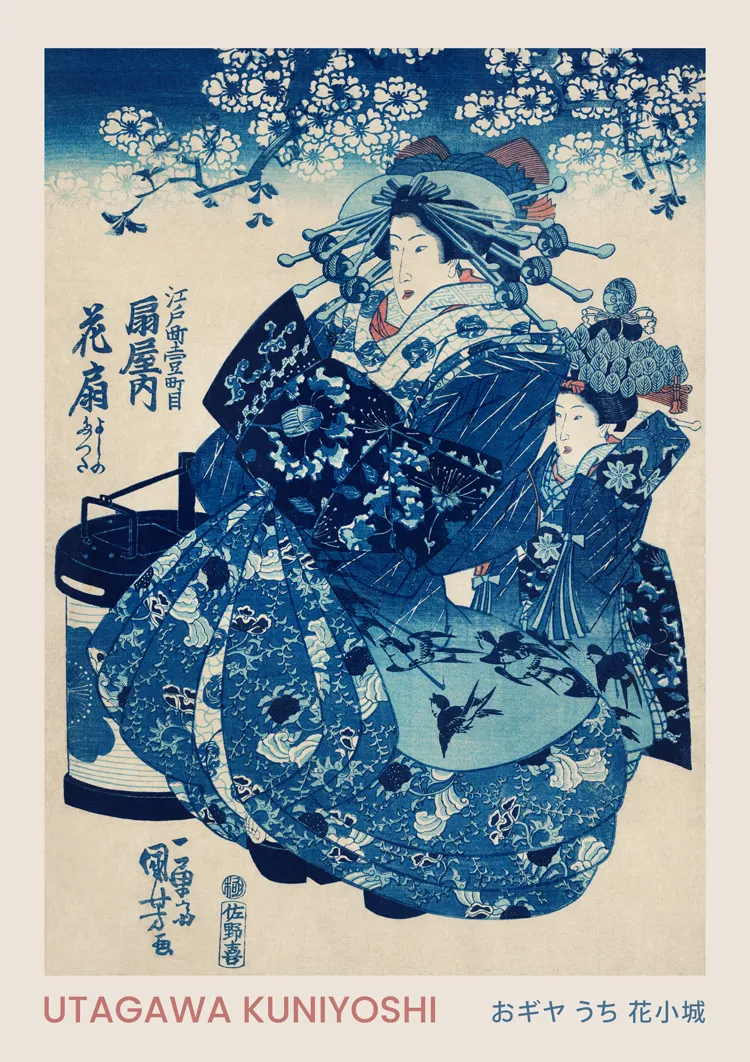 Dit schilderij van Utagawa Kuniyoshi toont een vrouw in sierlijke kleding die een waaier vasthoudt. Een kleinere figuur die op dezelfde manier gekleed is staat achter haar.