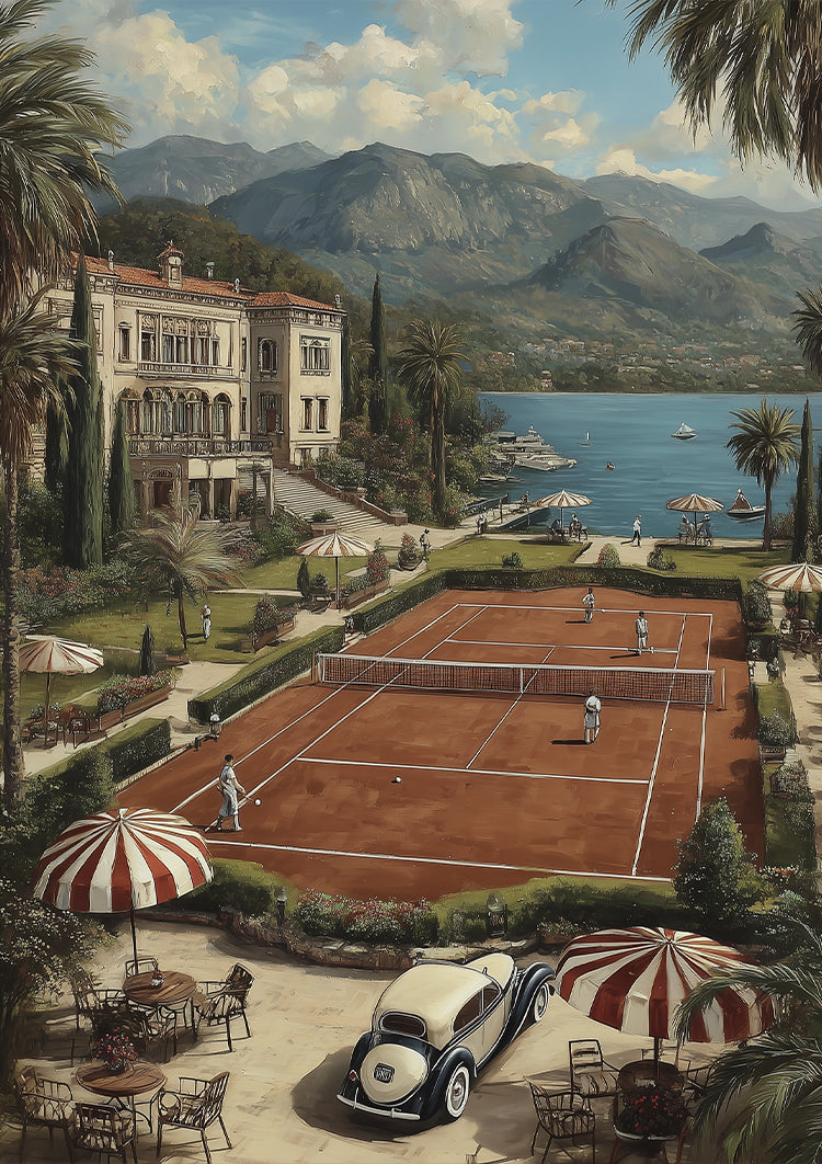 Een nostalgische scène van een luxe villa, tennisbaan en idyllisch meer, badend in zonlicht.