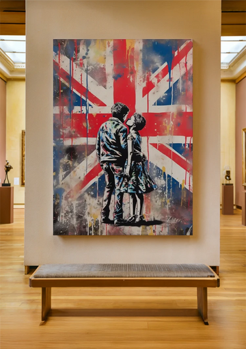 Een schilderij met twee jonge kinderen in een lieve omhelzing, kussend. De jongen draagt een pet en rugzak, het meisje in een roze jurk.