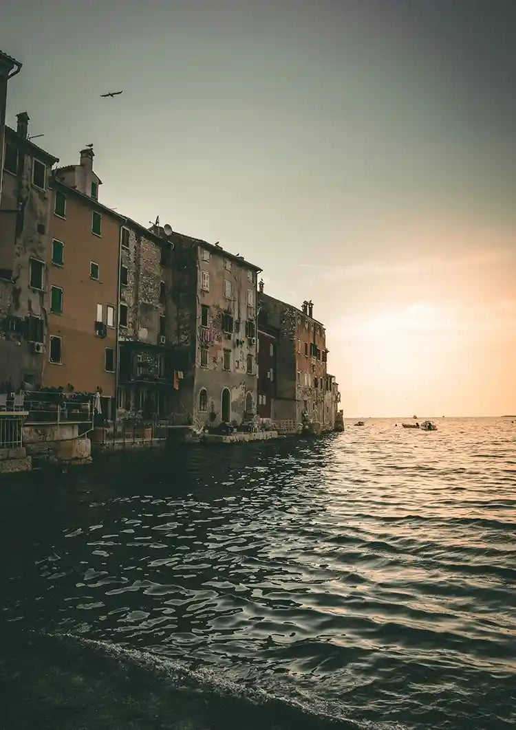 Dit schilderij toont oude gebouwen met verweerde gevels langs de waterkant bij zonsondergang.