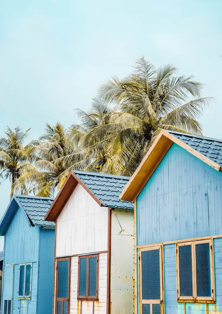 Een schilderij met drie kleurrijke huisjes met daarachter palmbomen.