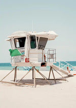 Dit schilderij toont een strandwachttoren op een zandstrand onder een heldere hemel, met het opschrift "Lifeguard On Duty"