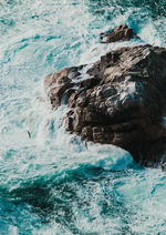 Een schilderij van de zee in actie, die wild tekeergaat tegen een rots.