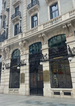 Dit schilderij toont een stijlvol gebouw met prachtig smeedwerk, waarop het gouden Hermes-logo schittert. Het straalt een tijdloze elegantie uit, perfect voor een luxe vibe.