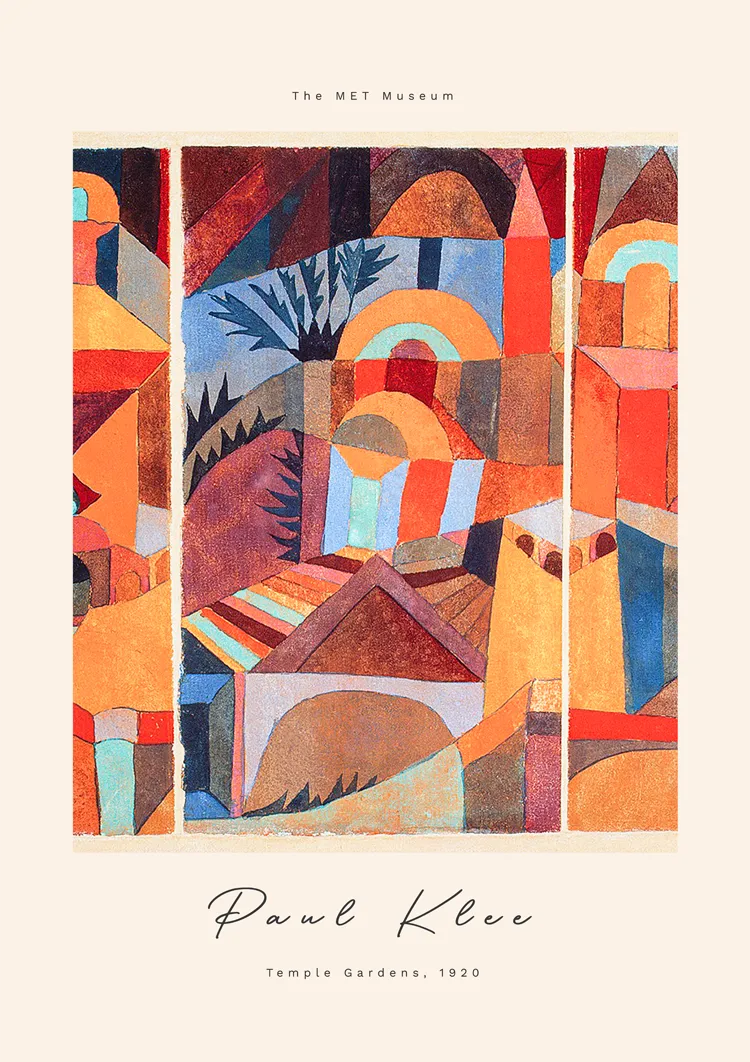 Dit schilderij "Temple Gardens 1920" van Paul Klee bevat abstracte vormen en levendige kleuren en vormt een compositie van geometrische vormen en patronen.