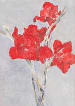 Een schilderij met levendige rode bloemen met groene stengels op een lichtgrijze achtergrond. Het kunstwerk maakt gebruik van krachtige penseelstreken om de bloemen weer te geven, waardoor ze een gestructureerd uiterlijk krijgen.