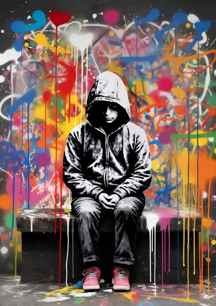 Dit schilderij toont een jongen die op een bankje, tegen een levendige, veelkleurige graffitiachtergrond.