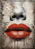 Dit schilderij toont straatkunst met een gezicht met opvallende rode druipende lippen en abstracte ogen op een getextureerde, afbladderende muur.