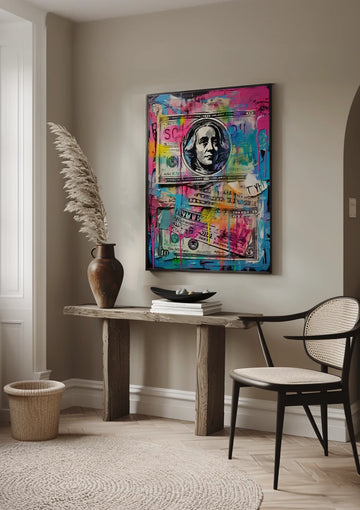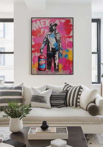 Ontdek de wereld van moderne street art, waar popcultuur en urban art samenkomen in een explosie van kleuren en vormen. Onze unieke collectie omarmt iconische figuren uit strips en films, afgebeeld op levendige wijze die de essentie van street art belichaamt. Van de tijdloze charme van Donald Duck, Dagobert Duck, Mickey mouse, Mini Mouse, Goofy, Monopoly, Popeye en the Pink panther, tot de stoere allure van filmhelden zoals Leonardo Dicaprio van The Wolf of Wallstreet, Tony Montana van Scarface, Vito Corleone van The Godfather, Henry Hill van Goodfellas, Al Capone en The Joker van Batman. Onze kunstwerken brengen deze personages tot leven op de achtergrond van kleurrijke schilderijen en dollarbiljetten.