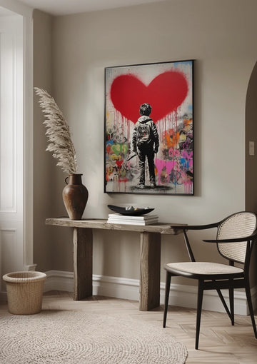 Boy Sketches Giant Heart on Wall Schilderij