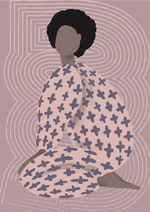 Illustratie van een persoon met een afrokapsel, met gekruiste benen, van achteren gezien. Ze dragen een outfit met patronen tegen een wervelende lavendelachtergrond.