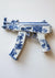 Schilderij van een sierlijk blauw en wit bloemmotief op een Uzi. Het ingewikkelde patroon contrasteert prachtig met de vorm van het wapen tegen een effen, gebroken witte achtergrond.