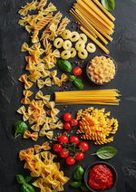 Dit schilderij toont een assortiment van pasta soorten, waaronder strikjes, tubes, spiralen en spaghetti, vergezeld van kerstomaatjes, basilicumblaadjes en knoflook op een donkere ondergrond.