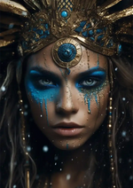 Dit schilderij toont een persoon met een uitgebreide hoofdtooi en felblauwe schmink. De hoofdtooi heeft gouden en blauwe accenten terwijl blauwe make-up en verf over het gezicht lopen, met sneeuwachtige deeltjes op de voorgrond.